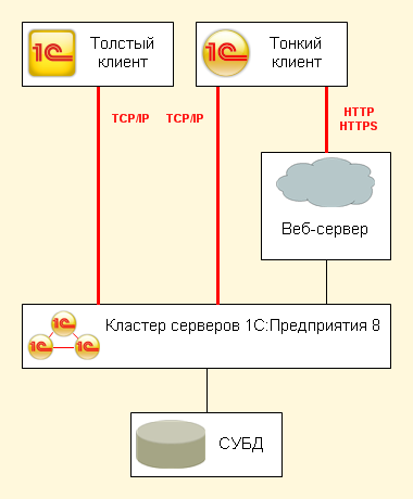 Однако у них разные возможности подключения к информационной базе. И тонкий клиент, и толстый клиент могут напрямую работать с файловой базой данных или подключаться по локальной сети, по протоколу TCP/IP к кластеру серверов 1С:Предприятия 8.