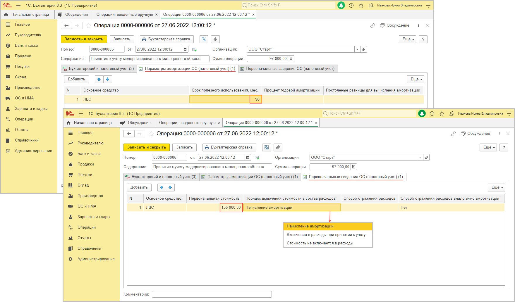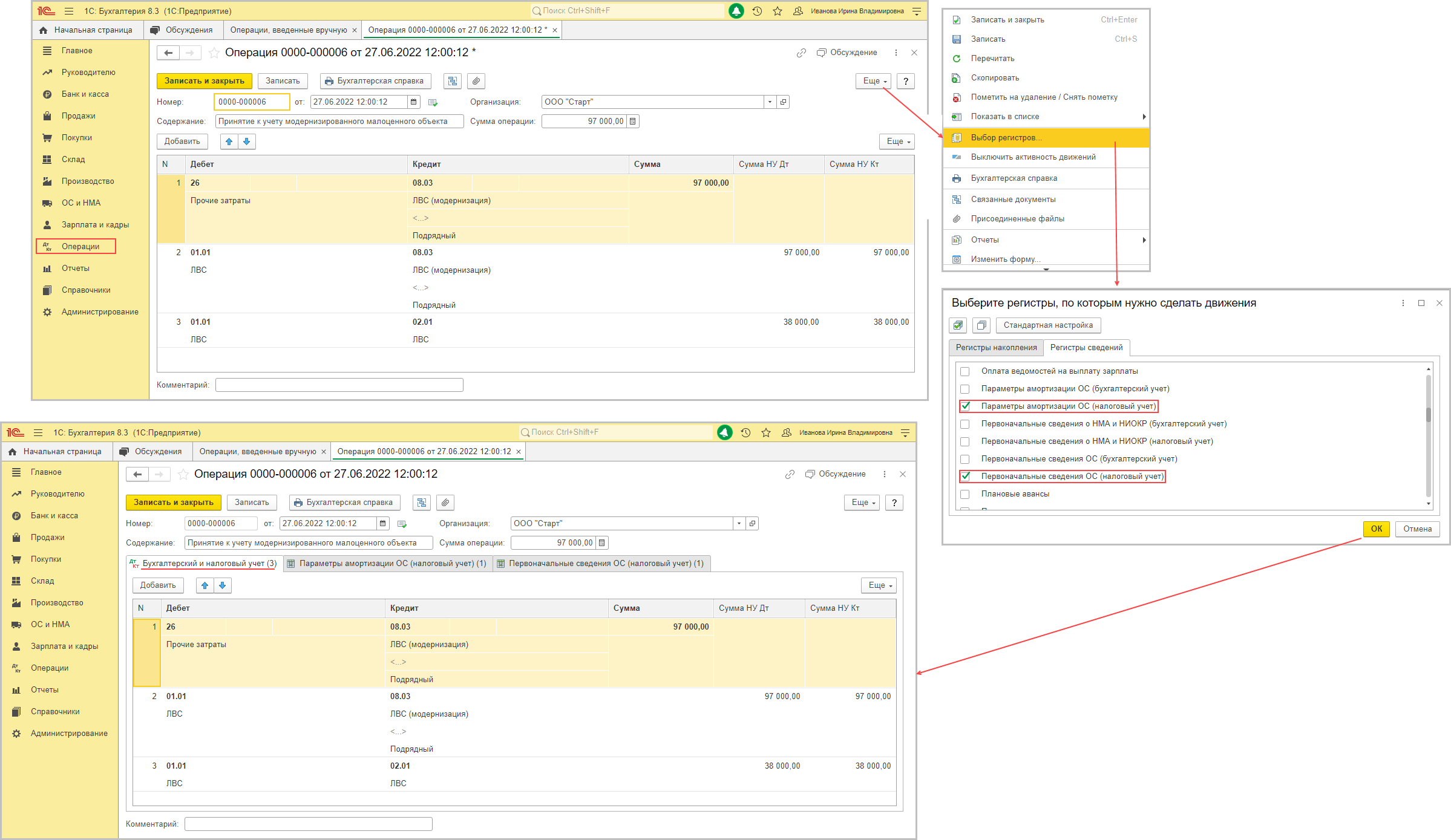 Ручной ввод хозяйственных операций с помощью документа «Операция» должен использоваться только в крайних случаях, когда отразить хозяйственную операцию с помощью документа конфигурации не представляется возможным. Для создания движений по регистрам предварительно проанализируйте, какие движения и по каким регистрам создаются в похожих ситуациях документами конфигурации.