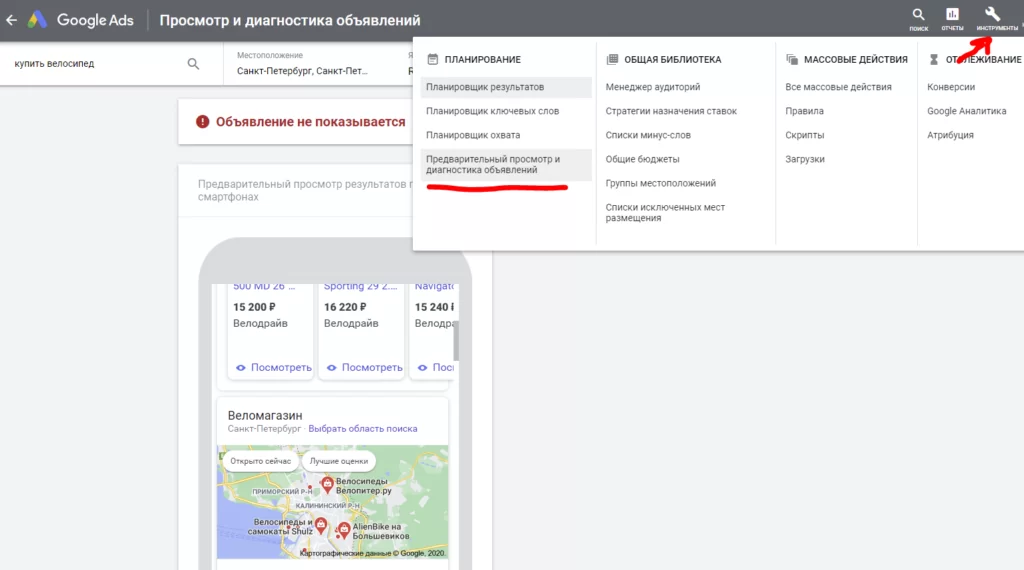 Чтобы получить доступ к предпросмотру и диагностике объявлений перейдите в Инструменты > Планирование > Предварительный просмотр и диагностика объявлений