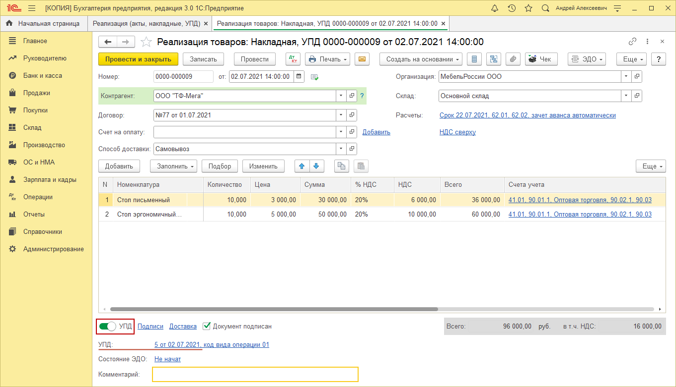 Также в документах на реализацию можно при выдаче УПД не регистрировать отдельно счета-фактуры, достаточно установить переключатель УПД в положение «Включено» (рис. 1).